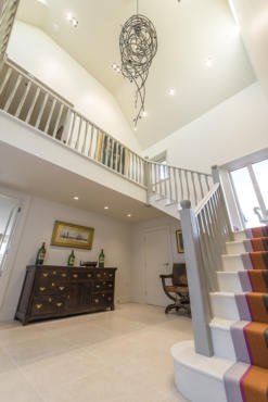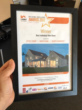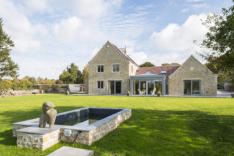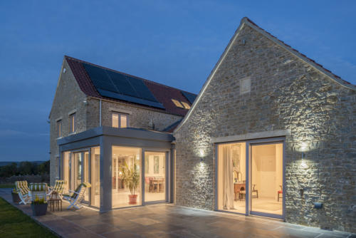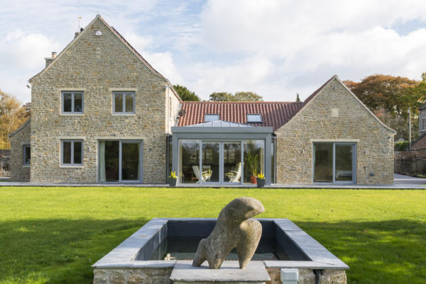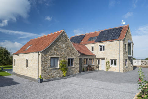 New build constructed in the grounds of Churchill Court, Somerset. It is a timber frame construction with natural stone cladding, clay pantile roof with garden room to rear. PV panels on roof and a MVHR system.